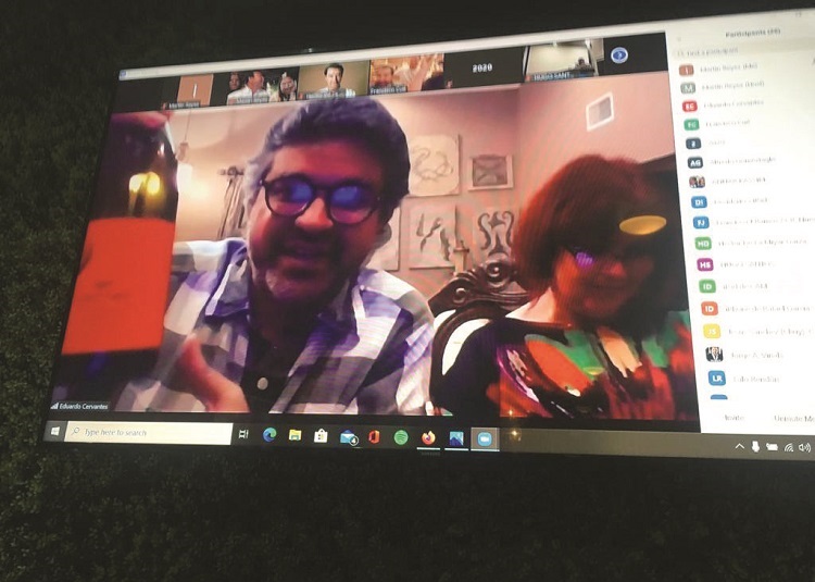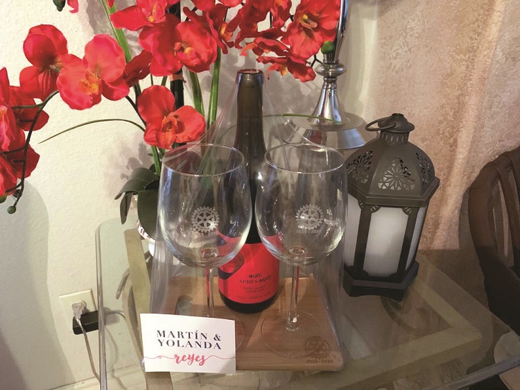 El presidente del Club Rotario Nuevo Laredo, Martín Reyes Madrigal y su distinguida esposa, Yolanda Arredondo de Reyes, le hicieron llegar a cada socio una botella de vino con 2 copas sobre una tabla grabada con el engrane Rotario, para que cada uno la disfrutara en su hogar mientras se conectaban vía zoom con el resto de los socios del club.